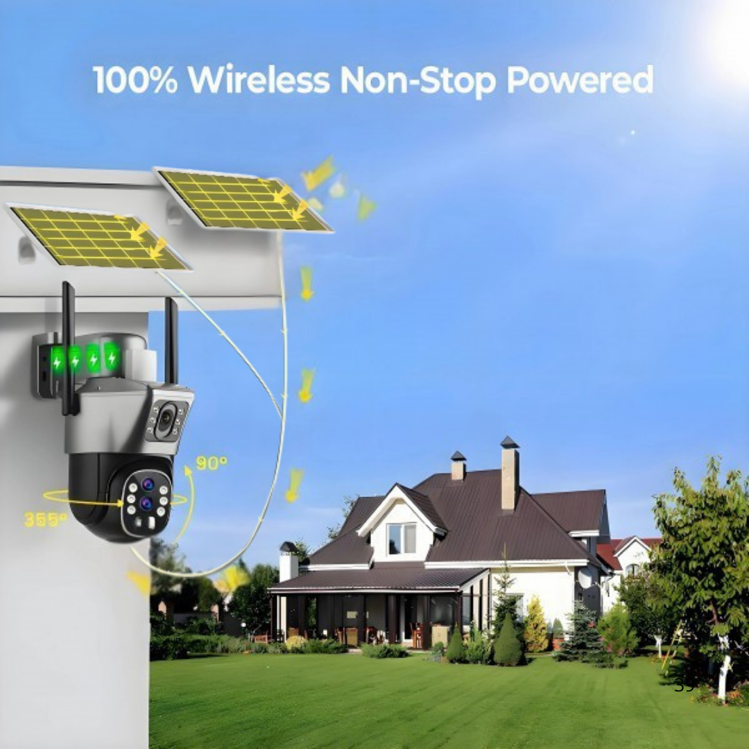 كاميرا مراقبة بالطاقة الشمسية مع ثلاث (3) عدسات و ZOOM X10 تعمل عن بعد على الهاتف مع مستشعر حركة ومتتبع حركة وزووم قوي يصل الي 100 متر ورؤية ليلية واضحة واندار قوي وسماعة ومايك وتحكم كامل بالحركة بجميع الاتجاهات ونظام تحديد المنطقة الامنة .